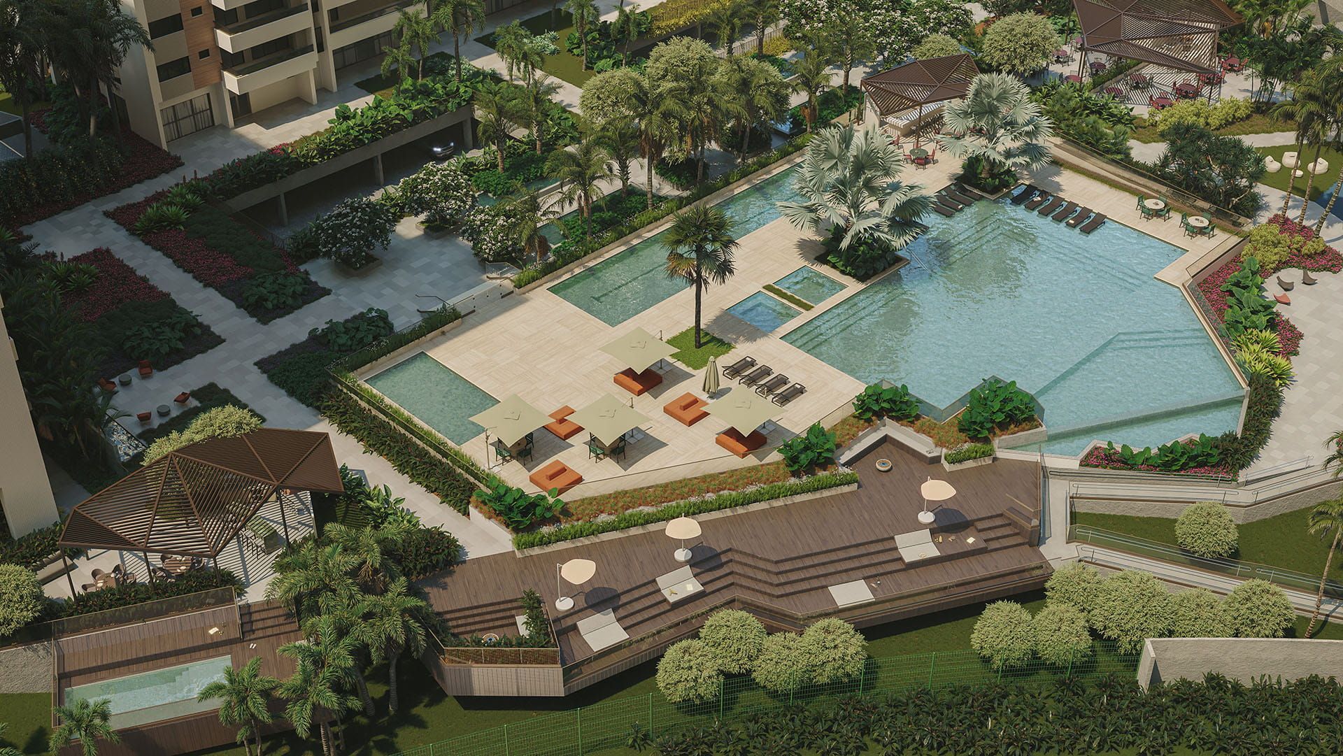 O bairro possui parque central, ciclovias e áreas de lazer ao ar livre, formando um ambiente que valoriza mobilidade, contato com áreas verdes e vida em comunidade. Esse conceito amplia a experiência de moradia para além dos limites do condomínio.